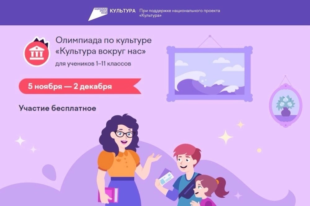 07.11.2024С 5 ноября по 2 декабря у школьников с 1 по 11 классы будет возможность принять участие в онлайн-олимпиаде «Культура вокруг нас» на образовательной платформе Учи.ру. Ключевая цель соревнования — развить интерес к русской культуре — языку, литературе, истории и искусству — и взглянуть на нее через призму современной жизни. Проект реализуется при поддержке национального проекта «Культура».Интерактивные задания помогут школьникам не только проверить свои знания, но и расширить кругозор, повысить общую эрудицию, а также тренируют образное и системное мышление. По итогу соревнования участники также научатся находить взаимосвязи между отечественной культурой и историей.«Вместе с партнерами Учи.ру мы всегда стараемся сделать олимпиаду интересным и ярким событием учебного года. В этот раз "Культура вокруг нас" охватит разные школьные предметы и области знаний — будут вопросы по русскому языку, литературе, искусству.. Ребята смогут не только проверить себя, но и расширить кругозор, а также познакомиться с мерами национального проекта "Культура". В прошлом году в Олимпиаде приняли участие более миллиона школьников по всей стране. В этом году состязание охватит и учащихся старших классов. Уверены, знания, полученные во время прохождения заданий, помогут в учебе и сдаче экзаменов», — сказала София Малявина, генеральный директор АНО «Национальные приоритеты».Для прохождения Олимпиады не требуется специальных знаний. Олимпиада состоит из 8 заданий и включает в себя разнообразный набор тем, чтобы ребенку было интересно и полезно её проходить. Нестандартный подход к решению задач помогает тренировать логику и критическое мышление.«Мы видим особый интерес школьников к тематике олимпиады. В проекте этого года мы сделали акцент на межпредметности — например, одно из заданий погружает в историю через изучение устаревших слов, другое — позволяет найти географические отсылки в литературных произведениях. Это дает ученикам возможность не только проверить свои знания, но и посмотреть на школьные предметы в едином культурном контексте, увидеть взаимосвязи, и главное — пробудить любознательность и интерес к изучению нашего богатого наследия», — отмечает Дарья Островская, руководитель департамента олимпиад образовательной платформы Учи.ру.Олимпиада бесплатна и доступна для всех учеников с 1 по 11 класс. Для участия необходимо зарегистрироваться на сайте https://cultura.uchi.ru/ или войти с логином и паролем от Учи.ру. На решение заданий у школьников будет 60 минут. Все участники соревнования получают сертификат, грамоту или диплом, в зависимости от результата, а учителя – благодарственные письма.Партнёрами Олимпиады стали портал Культура.рф, платформа «Артефакт» и Библиотеки нового поколения.! СправочноПо национальному проекту «Культура» по всей России, в том числе в отдаленных регионах и в сельской местности, ежегодно открываются модельные библиотеки, современные кинозалы и виртуальные концертные площадки, обновляются Дома культуры, театры юного зрителя, театры кукол и детские школы искусств. Фестивали и выставки получают грантовую поддержку, реализуются волонтерские инициативы и творческие проекты, проводятся онлайн-трансляции лучших культурных событий и культурно-просветительские программы для школьников.