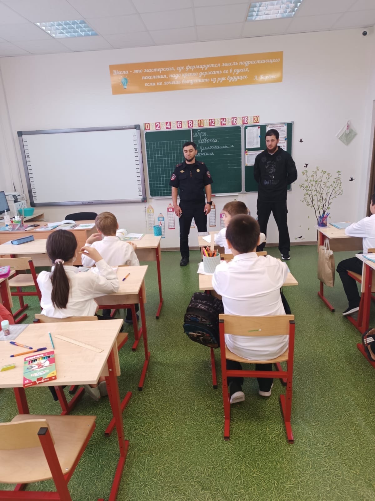11.09.2025В преддверии нового учебного года 11.09.2025 года инспектор ОПДНОП УМВД России от г. Грозного лейтенант полиции Абдулхаджиев Хизир Ильясович, провёл воспитательные беседы в классах, о правилах безопасного поведения в школе и на дорогах. Цель: воспитание правовой культуры школьников